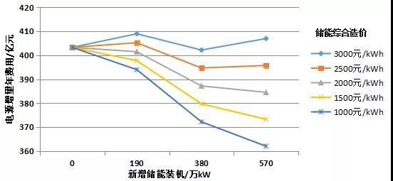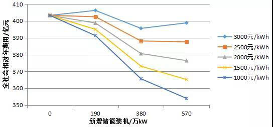 若儲能綜合造價為3000元/kWh,新增儲能裝置容量達到380萬kW/760萬kWh,全社會總年費用可降低7.7億元,平均每度電價格可降低0.007元/kWh;若儲能綜合造價降至2500元/kWh,全社會總年費用可降低15.2億元,平均每度電價格可降低0.014元/kWh。儲能價格下降越多,全社會經(jīng)濟性越好,社會所有參與者均可以從中獲益,關(guān)鍵在于紅利如何分配。