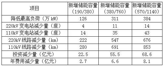 建設(shè)分布式儲能裝置后,可降低系統(tǒng)最高負荷,減少高壓電網(wǎng)輸電變工程的建設(shè),減少電網(wǎng)側(cè)投資。220kV電網(wǎng)變電容載比按1.9計算,110kV電網(wǎng)變電容載比按2.1計算,儲能對電網(wǎng)側(cè)投資的影響結(jié)果(見表3)。