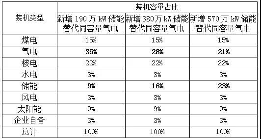 遠景夏季日最小負荷率為0.62,冬季日最小負荷率為0.46,日峰谷差較大。采取新增大規(guī)模儲能裝置替代同容量氣電機組,以實現(xiàn)用電負荷的削峰填谷,優(yōu)化負荷曲線。新增儲能規(guī)模及相應(yīng)電源裝機比例(見表2)。