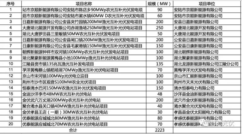 湖北省:20個(gè)項(xiàng)目,共2.22GW