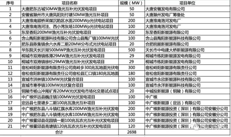 安徽?。?1個(gè)項(xiàng)目,共2.7GW