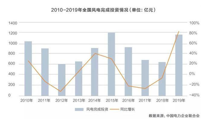 為鎖定高電價(jià),開(kāi)發(fā)商不惜重金“搶并網(wǎng)”。電力行業(yè)統(tǒng)計(jì)數(shù)據(jù)顯示,2019年全國(guó)主要發(fā)電企業(yè)電源工程完成投資 3139億元,同比提高12.6%。其中,水電814億元,同比增長(zhǎng)16.3%;火電630億元,同比下降20.0%;核電335億元,同比下降25.0%;風(fēng)電1171億元,同比增長(zhǎng)82.4%。在各主要能源類型中,風(fēng)電投資增幅最大。