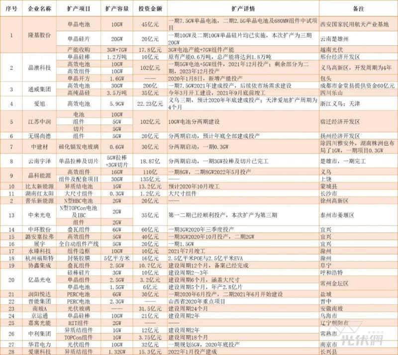 根據(jù)上市企業(yè)的擴(kuò)產(chǎn)公告以及各地政府2020年重點(diǎn)工程的不完全統(tǒng)計(jì),在短短的三個(gè)月內(nèi),光伏企業(yè)發(fā)布的擴(kuò)產(chǎn)以及開工信息中,涉及投資總額超過1200億,主要擴(kuò)產(chǎn)方向?yàn)楣枇?、硅片、電池片以及組件,其中硅料約4.7萬噸,硅片約26.6GW,電池片約84GW,組件約104GW,基本涵蓋了光伏行業(yè)上游的整個(gè)產(chǎn)業(yè)鏈。以下表格為擴(kuò)產(chǎn)詳情: