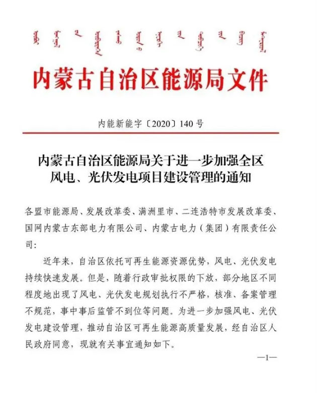 內(nèi)蒙古自治區(qū)能源局關(guān)于進(jìn)一步加強(qiáng)全區(qū)風(fēng)電、光伏發(fā)電項(xiàng)目建設(shè)管理的通知