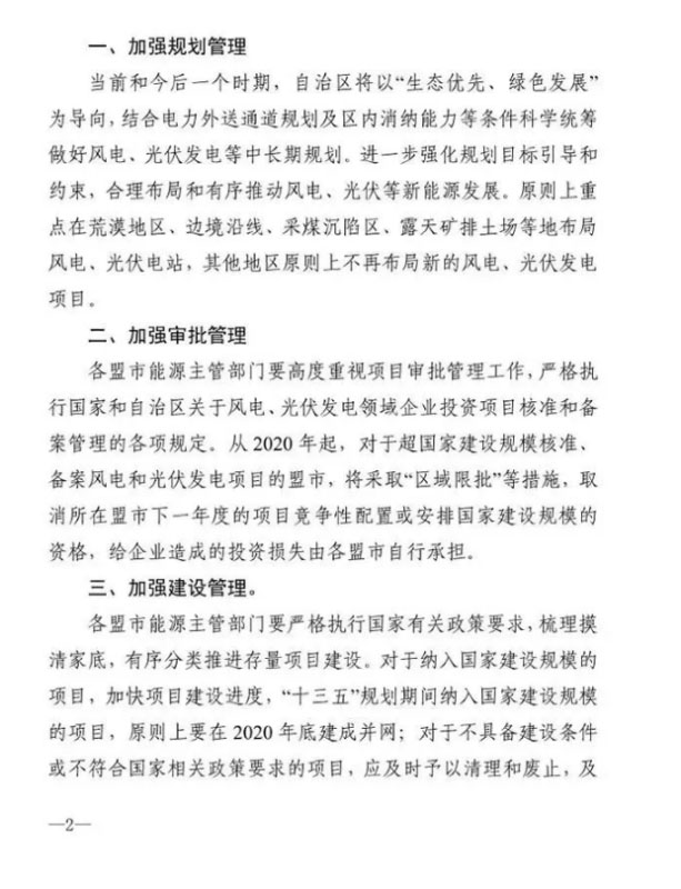 2、從2020年起,對(duì)于超國家建設(shè)規(guī)模核準(zhǔn)、備案風(fēng)電和光伏發(fā)電項(xiàng)目的盟市,將采取“區(qū)域限批”等措施,取消所在盟市下一年度的項(xiàng)目競(jìng)爭(zhēng)性配置或安排國家建設(shè)規(guī)模的資格,給企業(yè)造成的投資損失由各盟市自行承擔(dān)。