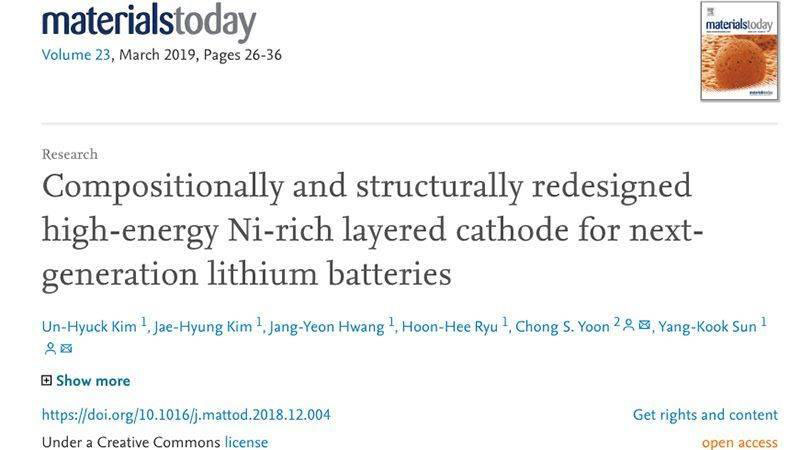 Un-Hyuck Kim團(tuán)隊(duì)在2019年3月發(fā)布于Materialstoday的論文《成分與結(jié)構(gòu)重新設(shè)計(jì)的高能富鎳正極,用于下一代鋰電池》。