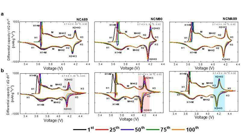 通過對(duì)NCMA89、NCA89、NCM90三類電池進(jìn)行100次的充放電循環(huán)測試,Un-Hyuck Kim團(tuán)隊(duì)發(fā)現(xiàn),只有NCMA89的H2-H3不可逆相變的電壓幾乎維持在了初始的狀態(tài),而NCM90與NCA89電池的H2-H3不可逆相變的電壓均出現(xiàn)了不同程度的下滑,氧化還原峰下降。