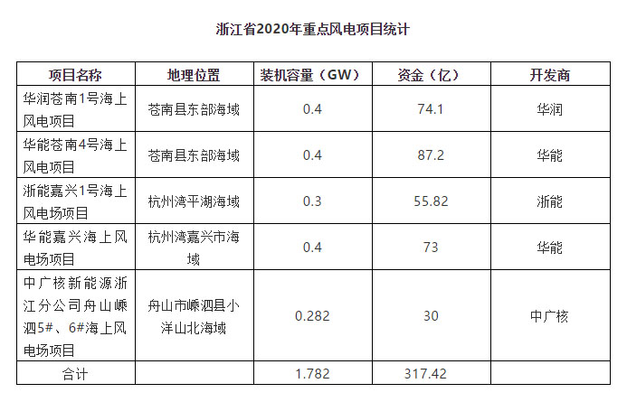 近日,浙江省發(fā)展改革委印發(fā)《2020年省重點建設(shè)及預(yù)安排項目計劃》 。其中涉及5個風(fēng)電項目,全部為海上風(fēng)電。合計共1.782GW,投資總額為317.42億元。