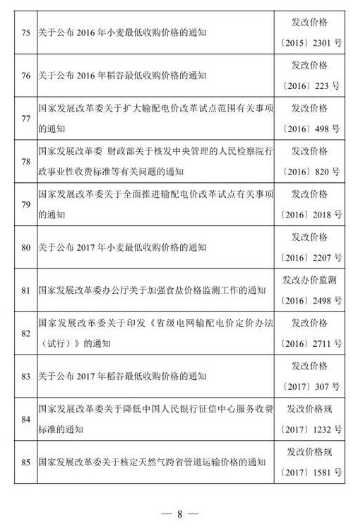為貫徹落實黨中央、國務院關于深入推進簡政放權、放管結合、優(yōu)化服務,改善營商環(huán)境的有關要求,經商國務院相關部門,決定廢止《國家物價局、財政部關于發(fā)布中央管理的地礦系統(tǒng)行政事業(yè)性收費項目及標準的通知》(價費字〔1992〕251號)等85件價格規(guī)范性文件,現(xiàn)予以公告。