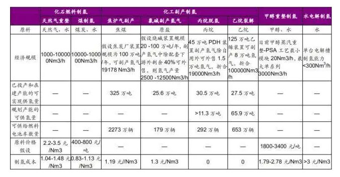 (1)從出廠成本來看,焦爐氣、氯堿、丙烷脫氫制丙烯和乙烷裂解制烯烴副產(chǎn)的粗氫氣可以經(jīng)過脫硫、變壓吸附和深冷分離等精制工序后作為燃料電池車用氫源,成本遠低于化工燃料制氫、甲醇重整制氫和水電解制氫等路線。