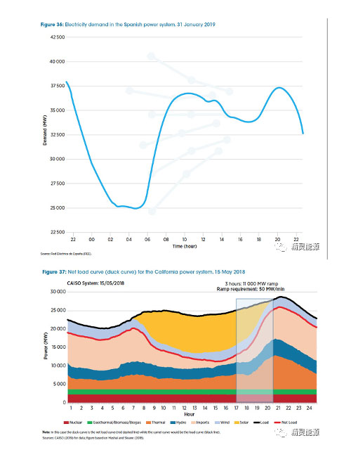 鴨子曲線最早在加利福尼亞被發(fā)現(xiàn),而且曲線效果非常明顯。但在美國其他地區(qū),如新英格蘭州也觀察到了這種現(xiàn)象(Roselund,2018)。為了管理這一凈負(fù)荷曲線,電網(wǎng)運(yùn)營商需要應(yīng)用一種能夠快速響應(yīng)調(diào)節(jié)生產(chǎn)和滿足凈需求急劇變化的設(shè)備組合。在加利福尼亞州,第一個向上的斜坡出現(xiàn)在早晨,大約從凌晨4點(diǎn)開始。