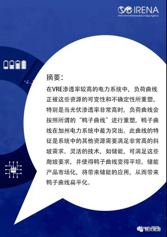 在VRE滲透率較高的電力系統(tǒng)中,負(fù)荷曲線正被這些資源的可變性和不確定性所重塑。特別是當(dāng)光伏滲透率非常高時,負(fù)荷曲線會按照所謂的“鴨子曲線”進(jìn)行重塑,鴨子曲線在加州電力系統(tǒng)中最為突出。此曲線的特征是系統(tǒng)中的其他設(shè)備需要滿足非常高的爬坡需求。靈活的技術(shù),如儲能,可滿足這些爬坡的要求,并使得鴨子曲線變得平坦。儲能產(chǎn)品市場化,將帶來儲能的應(yīng)用,從而帶來鴨子曲線扁平化。