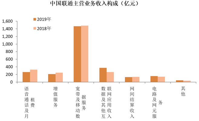 中國聯(lián)通2019年實(shí)現(xiàn)主營業(yè)務(wù)收入人民幣2644億元,較2018年同比上漲0.3%。在這2644億元的主營業(yè)務(wù)中,語音通話及月租費(fèi)、增值服務(wù)、寬帶及移動(dòng)數(shù)據(jù)服務(wù)、網(wǎng)間結(jié)算收入相比2018年同期都有所下降。數(shù)據(jù)及其他互聯(lián)網(wǎng)應(yīng)用收入和電路及網(wǎng)元服務(wù)相比2018年同期有所增長。