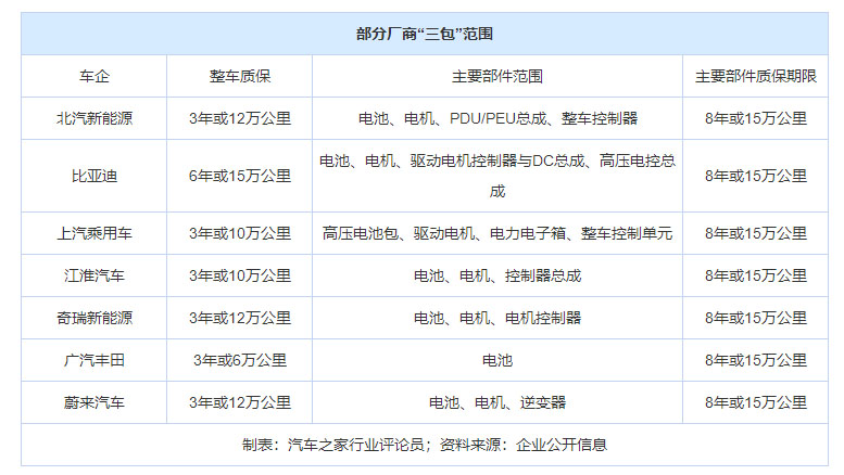 即便如此,但公允地說,汽車廠商對新能源汽車主要零部件的質(zhì)保期限普遍要高于《汽車三包規(guī)定》。這一方面是受國家新能源汽車國補(bǔ)政策的要求,另一方面也是企業(yè)讓消費(fèi)者放心的措施。但是,不為新能源汽車設(shè)立專門的“三包”規(guī)定也出現(xiàn)了許多問題,其中最突出的一點(diǎn)是,各個廠家對于提供”三包“的主要部件的范圍差別較大,如下表所示。