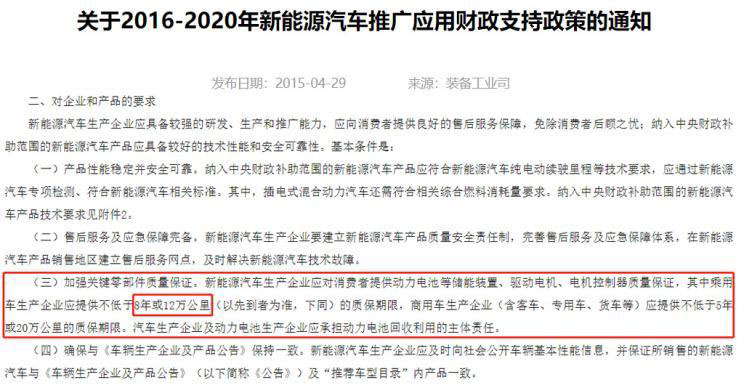 目前,廠商關(guān)于新能源汽車的質(zhì)保標(biāo)準(zhǔn),是按照2015年時發(fā)布的《財政部、科技部、工業(yè)和信息化部、發(fā)展改革委關(guān)于2016-2020年新能源汽車推廣應(yīng)用財政支持政策的通知》(以下簡稱“2015年國補(bǔ)政策”)中的要求設(shè)定的,即對動力電池等儲能裝置、驅(qū)動電機(jī)、電機(jī)控制器的質(zhì)量保證,乘用車是不低于8年或12萬公里(以先到者為準(zhǔn))。
