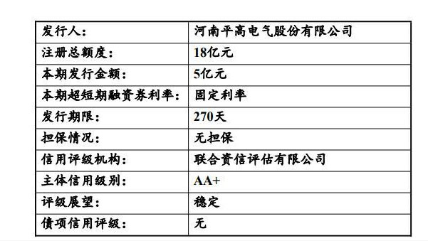 中國儲(chǔ)能網(wǎng)訊:3月23日,河南平高電氣股份有限公司發(fā)布2020年度第一期超短期融資券募集說明書,注冊總額度為18億元,本次擬發(fā)行5億元超短融,發(fā)行期限270天。