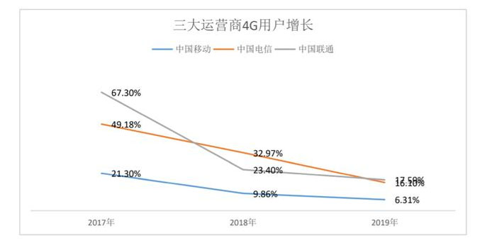 我們看看2017年至2019年三大運營商4G用戶同比增長率。