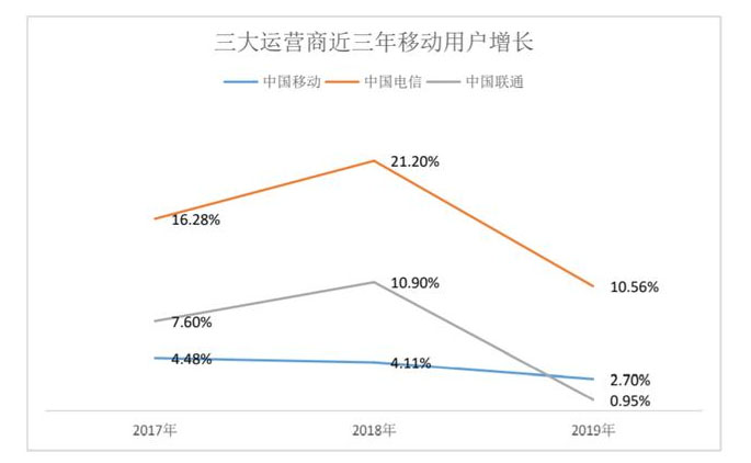 如果看2017年至2019年移動用戶同比增長率,也許我們能清晰的感受到運營商移動用戶增幅放緩的局面。