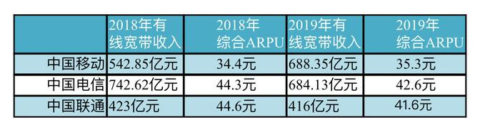 2019年,在提速降費以及中國移動低價套餐沖擊下,中國電信與中國聯(lián)通有線寬帶綜合ARPU有所下降,但也高出中國移動7元左右。