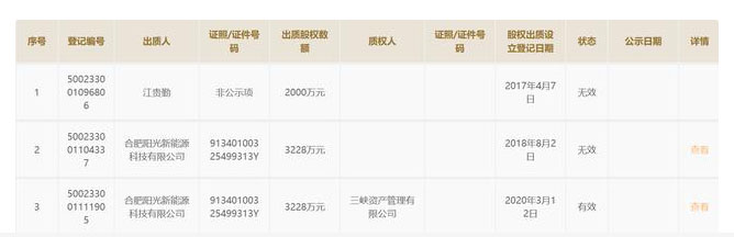 忠縣吉電新能源有限公司(下稱“忠縣吉電”)工商資料顯示,其股東之一、陽(yáng)光電源旗下的合肥陽(yáng)光新能源科技有限公司(下稱“合肥陽(yáng)光”)將其持有的忠縣吉電股權(quán)出質(zhì)予三峽資產(chǎn)管理有限公司,出質(zhì)股權(quán)數(shù)額為3228萬(wàn)元,登記編號(hào)為500233001111905。