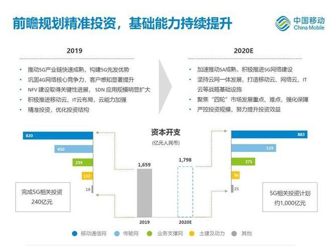 首先,三大運(yùn)營商5G投入相比去年成倍提高。中國移動(dòng)2020年預(yù)期資本開支為1798億元,其中5G相關(guān)投資計(jì)劃約為1000億元,而去年是240億元,今年足足翻了5倍。