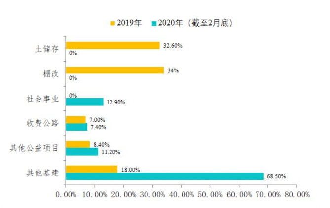 并且2019年9月國(guó)常會(huì)明確2020年提前下達(dá)地方政府新增專項(xiàng)債,不得投向棚改、土儲(chǔ)等項(xiàng)目。這使得2020年專項(xiàng)債投向基本都以基建為主,并未涉及土儲(chǔ)和棚改。