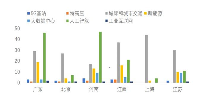 ▲圖7:六省、直轄市在七大領(lǐng)域的“新基建”項(xiàng)目數(shù)量