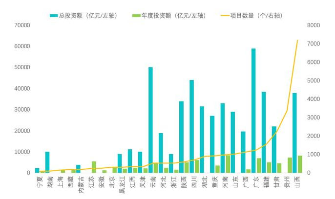 從項(xiàng)目數(shù)量來看,排在第一位的是山西,共發(fā)布了7181個(gè)重大項(xiàng)目,預(yù)計(jì)項(xiàng)目總投資37879億元,2020年年內(nèi)預(yù)計(jì)投資8151億元。