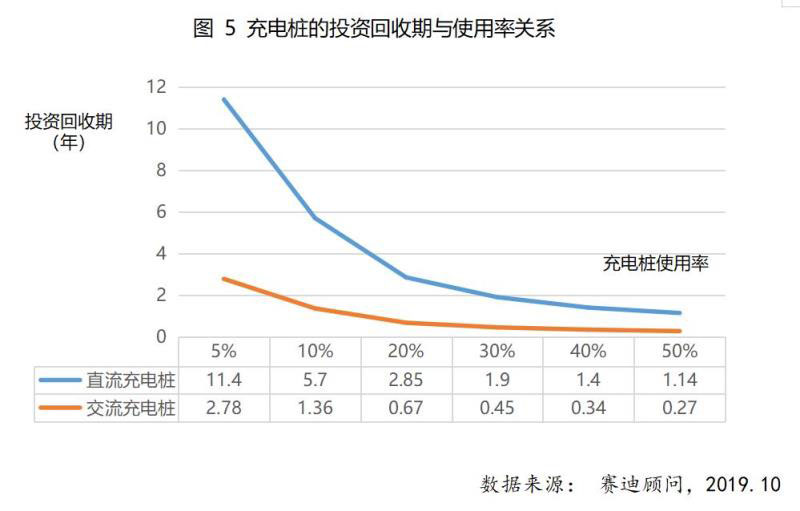 分析充電樁項目的投資與運營情況可以發(fā)現(xiàn),充電樁的投資回收期與充電樁的使用率關(guān)系密切。對于交流慢充樁來說,使用率為5%的情況下,回收期需要近3年,若提升使用率到30%(每天充電8小時),則投資回收期被縮短到半年以內(nèi)。這個情況對于直流快充樁表現(xiàn)更為明顯,在使用率為5%和30%的情況下,投資回收期分別為12年和2年。提升充電樁使用率將大幅度縮短充電樁的投資回收期。
