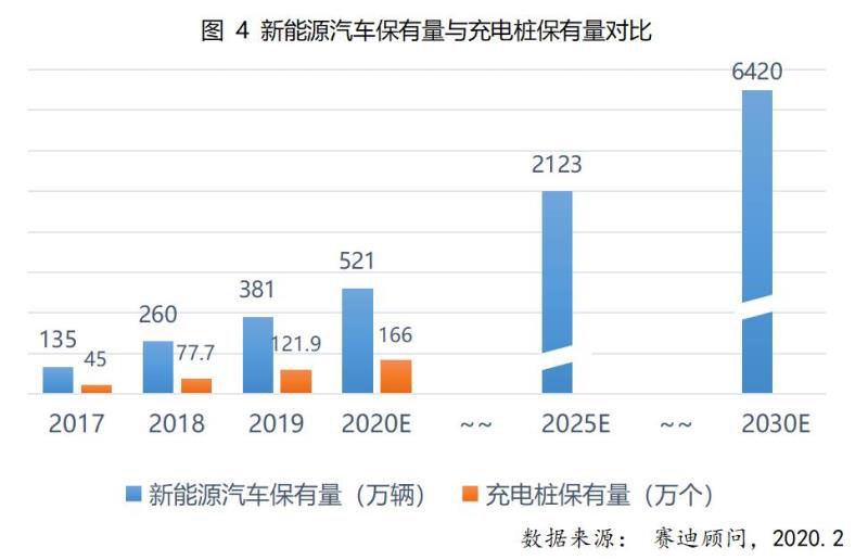 工信部于2019年末發(fā)布《新能源汽車產(chǎn)業(yè)發(fā)展規(guī)劃(2021~2035)》征求意見稿指出,計劃到2025年,新能源汽車銷量占比達到新車銷量的25%。預(yù)計到2030年,我國新能源汽車保有量將達到6420萬輛,根據(jù)車樁比1:1的建設(shè)目標(biāo),未來10年,我國充電樁建設(shè)仍然存在6300萬的缺口,預(yù)計將形成10253億的充電樁基礎(chǔ)設(shè)施建設(shè)市場。