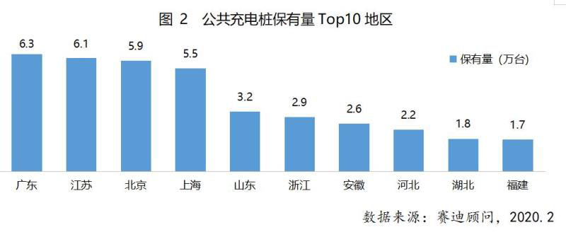 從充電樁區(qū)域分布看,廣東、江蘇、北京、上海充電樁保有量較高,均高于五萬臺,其后是山東、浙江、安徽等地區(qū),全國TOP10地區(qū)建設(shè)的公共充電樁占比達73.9%。
