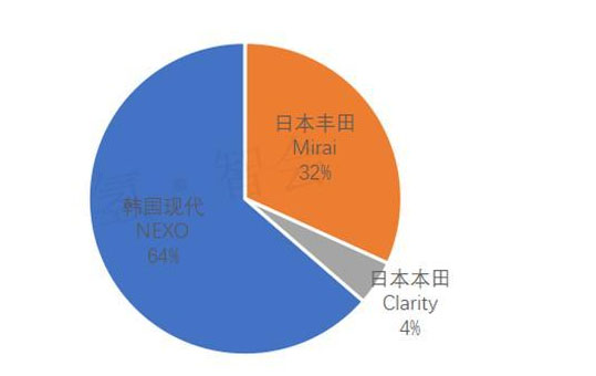 這些氫燃料電池乘用車主要為韓國現(xiàn)代NEXO和日本豐田Mirai。其中,現(xiàn)代NEXO銷量占據(jù)行業(yè)第一名,數(shù)量4818輛;第二名豐田Mirai,數(shù)量2407輛;第三名本田Clarity,數(shù)量349輛。