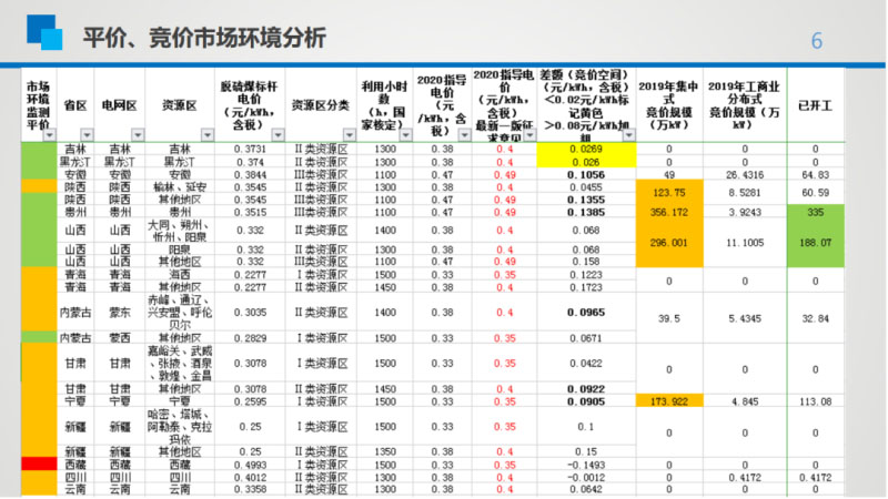 另外,從2019年光伏發(fā)電市場監(jiān)測情況來看,根據(jù)此前西北電力勘測設(shè)計院總圖所所長惠星的演講資料,2019年僅有西藏被劃為紅色區(qū)域,除了2018年的紅色區(qū)域新疆、甘肅轉(zhuǎn)為橙色之外,綠色區(qū)域的覆蓋面積也大幅增加,2018年被劃為橙色區(qū)域的山東、內(nèi)蒙古、河北、福建、海南、重慶等均轉(zhuǎn)為綠色,這對于2020年的光伏項目發(fā)展也是一大利好。據(jù)了解,2019年光伏發(fā)電市場環(huán)境監(jiān)測評價結(jié)果還結(jié)合了競價項目的完成情況。