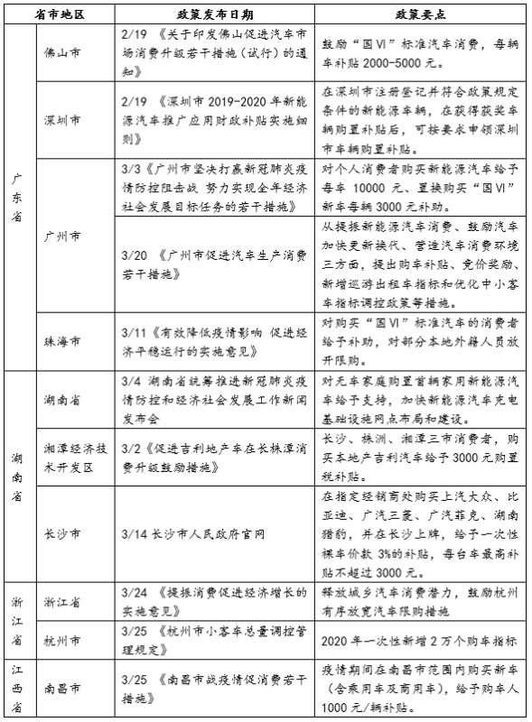 地方政府層面,截止3月27日,已有9個城市及地區(qū)出臺了落實促進汽車消費的政策,包括:廣東省佛山、廣州、珠海,深圳市,湖南省長沙、株洲、湘潭,浙江省杭州市,江西省南昌市。以下為來自網絡信息的不完全統(tǒng)計: