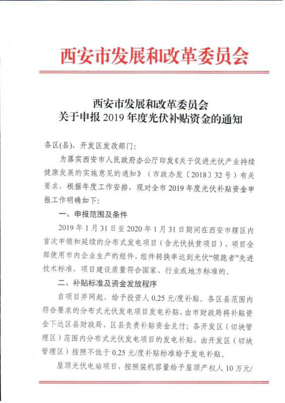 近日,陜西省西安發(fā)改委下發(fā)《關(guān)于申報2019年度光伏補(bǔ)貼資金的通知》(以下簡稱“《通知》”)。