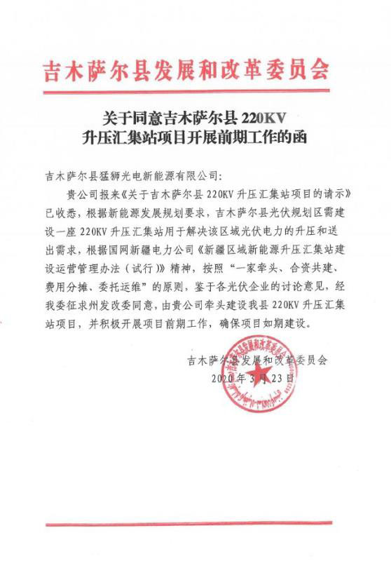 3月23日,猛獅科技旗下吉木薩爾縣猛獅光電新能源有限公司收到吉木薩爾縣發(fā)展和改革委員會《關(guān)于同意吉木薩爾縣220KV升壓匯集站項目開展前期工作的函》,確定吉木薩爾縣猛獅光電公司牽頭建設(shè)該縣220KV升壓匯集站項目。