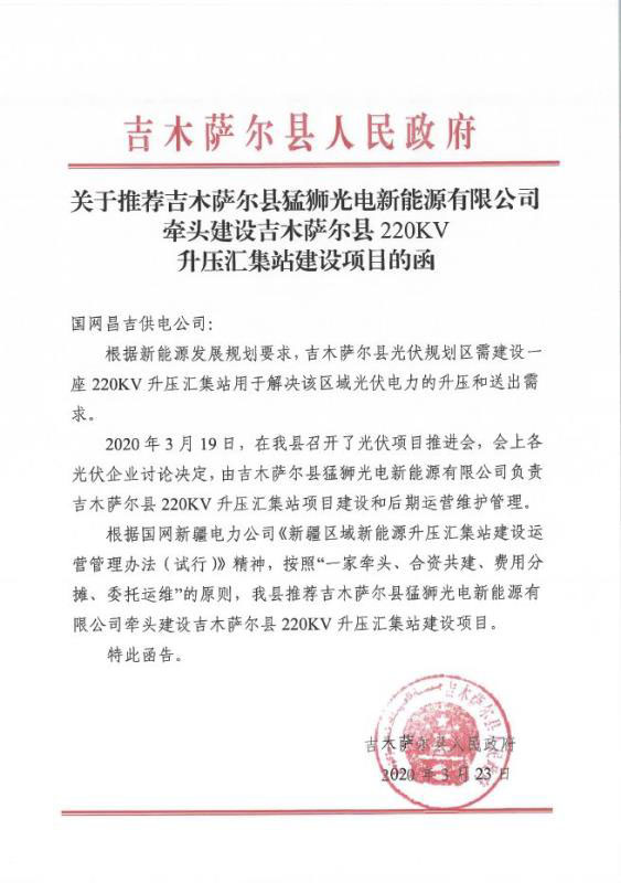 同日,吉木薩爾縣人民政府就該項目專門致函國網(wǎng)昌吉供電公司,明確推薦吉木薩爾縣猛獅光電公司牽頭建設(shè)該縣220KV升壓匯集站項目。