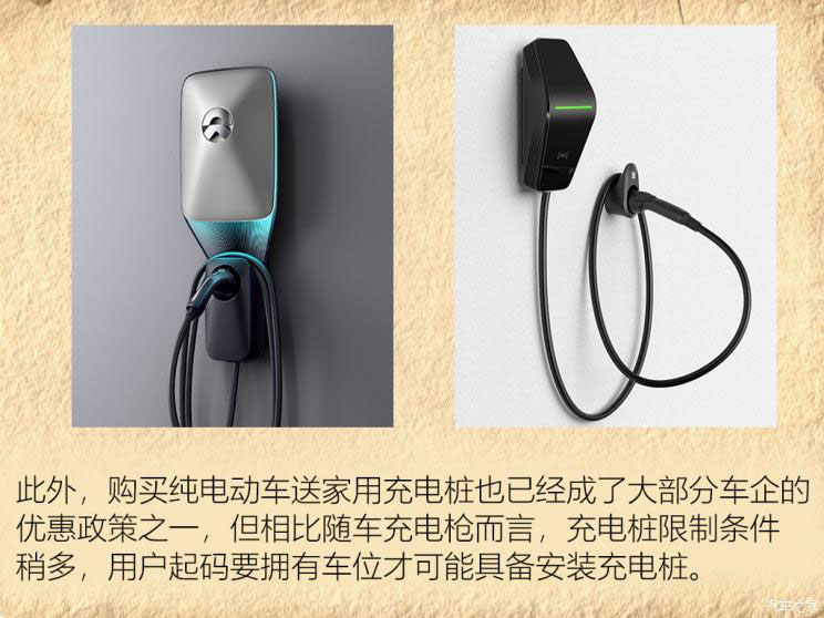 此外,購(gòu)買純電動(dòng)車還會(huì)得到附贈(zèng)家用充電樁,并提供免費(fèi)安裝,但這要求用戶擁有固定車位或可安裝充電樁的條件。家用充電樁的充電功率高于隨車充,普遍能達(dá)到6-8kW左右,對(duì)于電池容量為50kWh左右的純電動(dòng)車來說,理論上不到10小時(shí)即可將電補(bǔ)滿,比較方便。