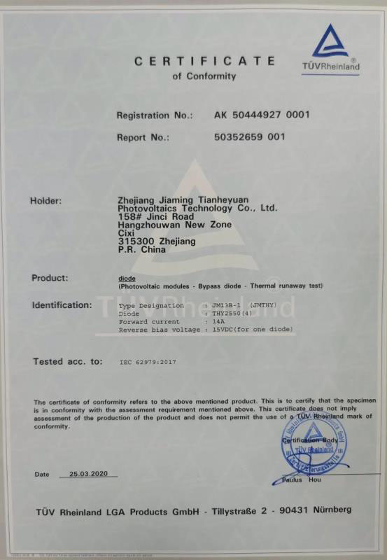 浙江佳明天和緣光伏科技有限公司的該款接線盒通過本次測試,達到了二極管正向電流14A,反向偏壓15Vd.c. (單顆極管)。
