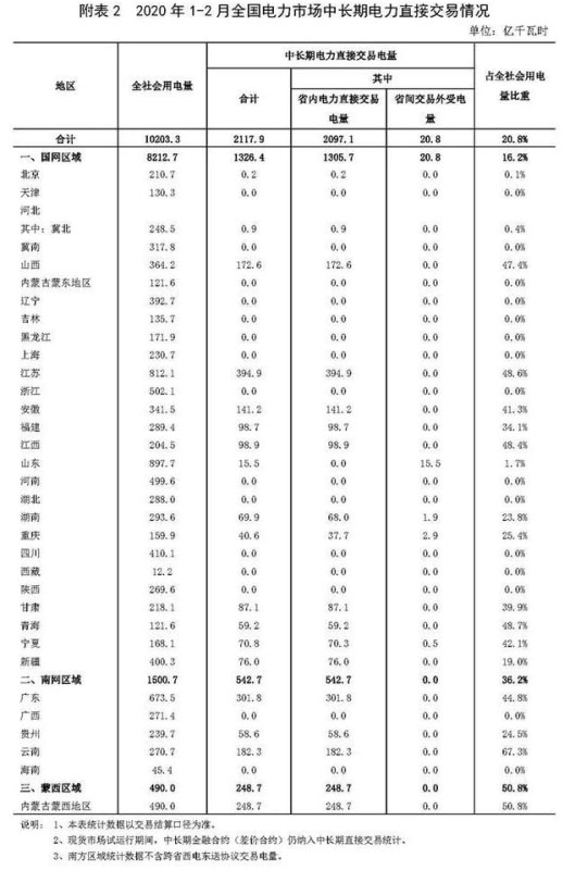 2020年1-2月,全國(guó)各電力交易中心累計(jì)組織完成市場(chǎng)交易電量(2)2672.9億千瓦時(shí)。其中,全國(guó)電力市場(chǎng)中長(zhǎng)期電力直接交易電量(3)合計(jì)為2117.9億千瓦時(shí),占全社會(huì)用電量比重為20.8%。