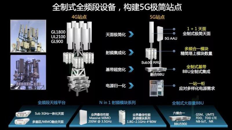在實(shí)際部署中, 5G設(shè)備支持全制式大容量BBU產(chǎn)品方案、N in 1多制式融合射頻和全頻段天線,可實(shí)現(xiàn)站點(diǎn)極簡(jiǎn),降低能耗和鐵塔租金。結(jié)構(gòu)如下: