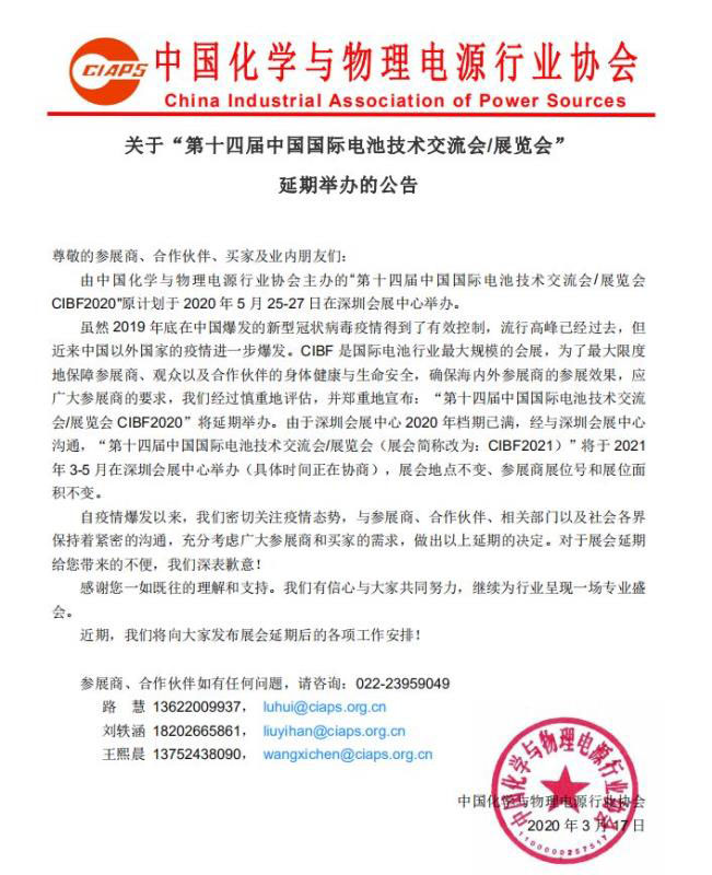 雖然2019年底在中國爆發(fā)的新型冠狀病毒疫情得到了有效控制,流行高峰已經(jīng)過去,但近來中國以外國家的疫情進(jìn)一步爆發(fā)。CIBF是國際電池行業(yè)最大規(guī)模的會(huì)展,為了最大限度地保障參展商、觀眾以及合作伙伴的身體健康與生命安全,確保海內(nèi)外參展商的參展效果,應(yīng)廣大參展商的要求,我們經(jīng)過慎重地評(píng)估,并鄭重地宣布:“第十四屆中國國際電池技術(shù)交流會(huì)/展覽會(huì)CIBF2020”將延期舉辦。由于深圳會(huì)展中心2020年檔期已滿,經(jīng)與深圳會(huì)展中心溝通,“第十四屆中國國際電池技術(shù)交流會(huì)/展覽會(huì)(展會(huì)簡(jiǎn)稱改為:CIBF2021)”將于2021年3-5月在深圳會(huì)展中心舉辦(具體時(shí)間正在協(xié)商),展會(huì)地點(diǎn)不變、參展商展位號(hào)和展位面積不變。