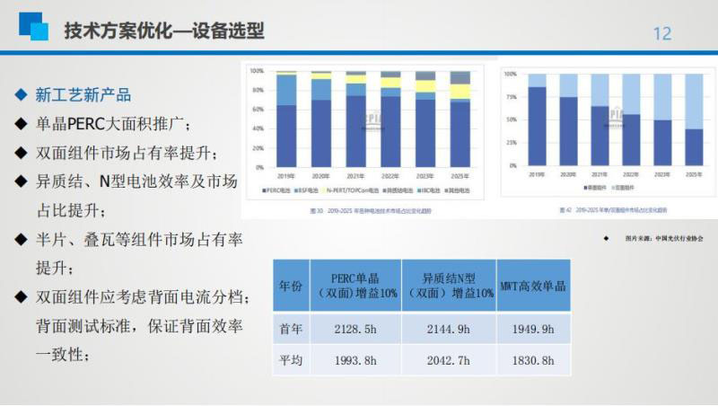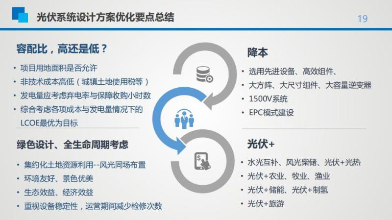 除容配比測(cè)算外,光伏系統(tǒng)設(shè)計(jì)方案優(yōu)化還應(yīng)盡可能采用先進(jìn)設(shè)備高效組件進(jìn)行降本以收益最優(yōu)進(jìn)行競(jìng)價(jià)方案測(cè)算,結(jié)合綠色設(shè)計(jì)與全生命周期考慮,并采用光伏+的方式,利用先進(jìn)商業(yè)模式彌補(bǔ)項(xiàng)目的損失等。