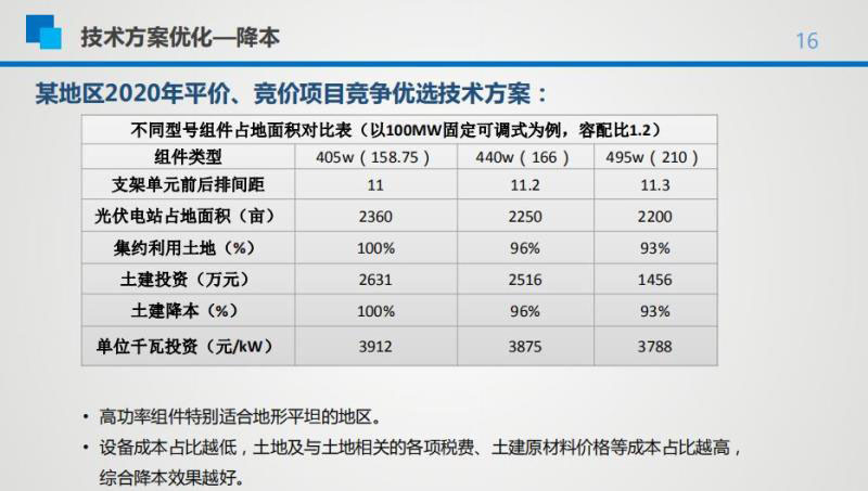 實(shí)際轉(zhuǎn)換效率才是真正提升發(fā)電量的指標(biāo),因此在先進(jìn)技術(shù)選型上應(yīng)更多關(guān)注實(shí)際轉(zhuǎn)換效率。據(jù)惠星介紹,在降低度電成本方面,高功率組件特別適合地形平坦的地區(qū)。設(shè)備成本占比越低,土地及土地相關(guān)各項(xiàng)稅費(fèi),土建原材料價(jià)格、鋼材、水泥等成本占比越高,高功率組件的綜合降本效果越好。此外,在選擇支架合適的運(yùn)行方式時(shí),應(yīng)充分考慮項(xiàng)的目地形地貌、地質(zhì)條件、用地面積能否有效率用、各項(xiàng)稅費(fèi)占比、環(huán)保要求是否嚴(yán)苛等。條件允許時(shí),推薦采用固定可調(diào)、平單軸跟蹤、仰角可調(diào)雙軸跟蹤等先進(jìn)技術(shù)提升發(fā)電量。