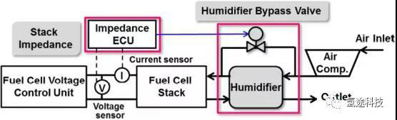 本田CLARITY燃料電池系統(tǒng)的陰極回路具有加濕器,并與旁通閥并聯(lián)?;贑CM含水量和電堆阻抗的關(guān)系特性,依據(jù)測得的電堆阻抗,調(diào)節(jié)旁通閥開度,定量地控制進(jìn)堆氣體濕度,確保電堆CCM含水量控制在最佳運(yùn)行濕度的上限和下限內(nèi),從而令堆內(nèi)濕度維持在適宜的水平。