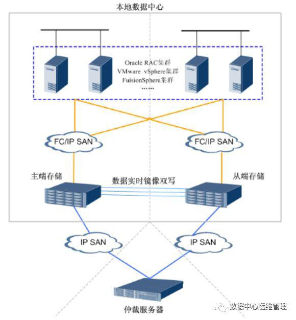 我行生產(chǎn)類業(yè)務(wù)系統(tǒng)均部署于全冗余架構(gòu)的共享存儲(chǔ)中,存儲(chǔ)平臺(tái)使用陣列雙活架構(gòu),兩臺(tái)高端存儲(chǔ)同時(shí)通過FC SAN網(wǎng)絡(luò)向上層主機(jī)集群提供業(yè)務(wù)訪問,兩臺(tái)存儲(chǔ)之間進(jìn)行實(shí)時(shí)數(shù)據(jù)同步。當(dāng)出現(xiàn)設(shè)備、鏈路等因素導(dǎo)致其中一臺(tái)存儲(chǔ)不可被訪問,存儲(chǔ)底層進(jìn)行故障切換而不會(huì)停止數(shù)據(jù)讀寫,主機(jī)上層對底層的故障切換無感知,業(yè)務(wù)不中斷,真正做到了RTO和RPO都為零的本地高可靠容災(zāi)。