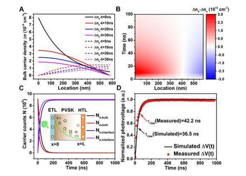 圖2. 鈣鈦礦吸收層中電荷傳輸?shù)哪M和光電壓的建立過(guò)程
