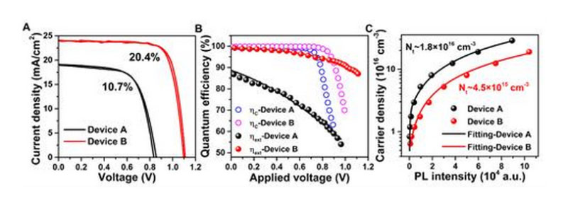 圖3. 鈣鈦礦太陽(yáng)能電池中的電瞬態(tài)研究:Device A and B光電轉(zhuǎn)換效率 (A)量化電荷抽取和收集量子效率(B)以及鈣鈦礦吸收層中的缺陷態(tài)密度(C)。