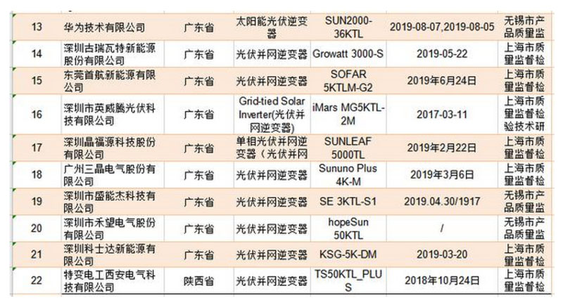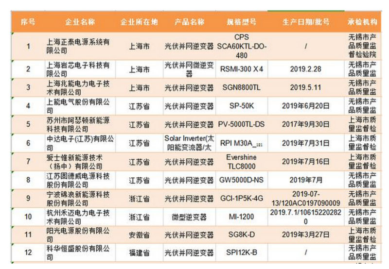 近期,市場監(jiān)管總局公布了2019年并網(wǎng)光伏逆變器質量國家監(jiān)督抽查情況。共抽查了7個?。ㄊ校ㄈA為,陽光,錦浪科技、禾望,固德威,特變電工、科士達在內的23家光伏逆變器企業(yè)成產的23批次光伏并網(wǎng)逆變器產品,其中1批次產品不合格,不合格發(fā)現(xiàn)率為4.3%。