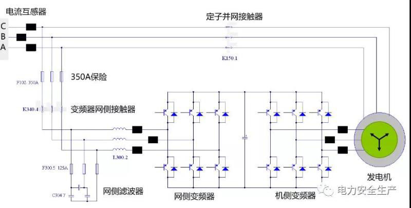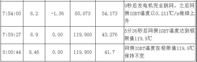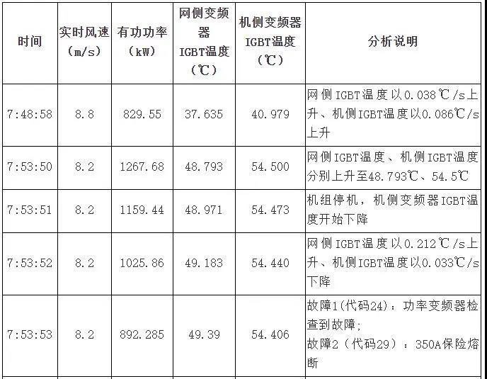 通過分析網(wǎng)側(cè)IGBT溫度突變的起始點、溫度達到極限值的終止點數(shù)據(jù)和故障信息可知,機組在正常運行狀態(tài)下,網(wǎng)側(cè)IGBT突然出現(xiàn)內(nèi)部過流故障,造成IGBT內(nèi)部溫度檢測回路開路(開路會導致溫度達到極限值)。網(wǎng)側(cè)IGBT過電流,將直接沖擊上級回路的350A保險,導致保險熔斷,機組報出保險熔斷故障。6min后線路跳閘。